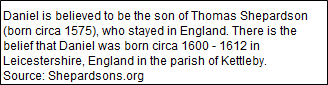 The second Daniel followed the trade of his father, making his home at Maiden, Mass., for some years. His name appears as one of a number who signed a petition to Sir William Phipps, 17 October 1694, praying to be permitted to establish a settlement at Attleboro, Mass. He seems to have owned land there as early as 1660. He took a prominent part in the town affairs. With this removal from Malden the Shepardson family found its home in a tract of land called "Rehoboth North Purchase", which included what later became the towns of Cumberland, Rhode Island, and Attleboro, Norton, and Mansfield, Mass., places in which the family has been represented almost continuously for more than two hundred years.
