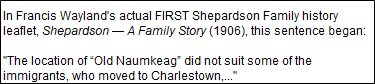 For the Francis Wayland Shepardson history leaflets, where a later leaflet contained additions & corrections to information from a previous leaflet, I have made those additions & corrections for this compilation. This actually caused a MAJOR change for my family's line along with some other lines due to information in leaflets #6 & #7. Where a history had numbers before or after people's names to indicate where to find them in that history, I have removed those numbers as they are unnecessary on a website.